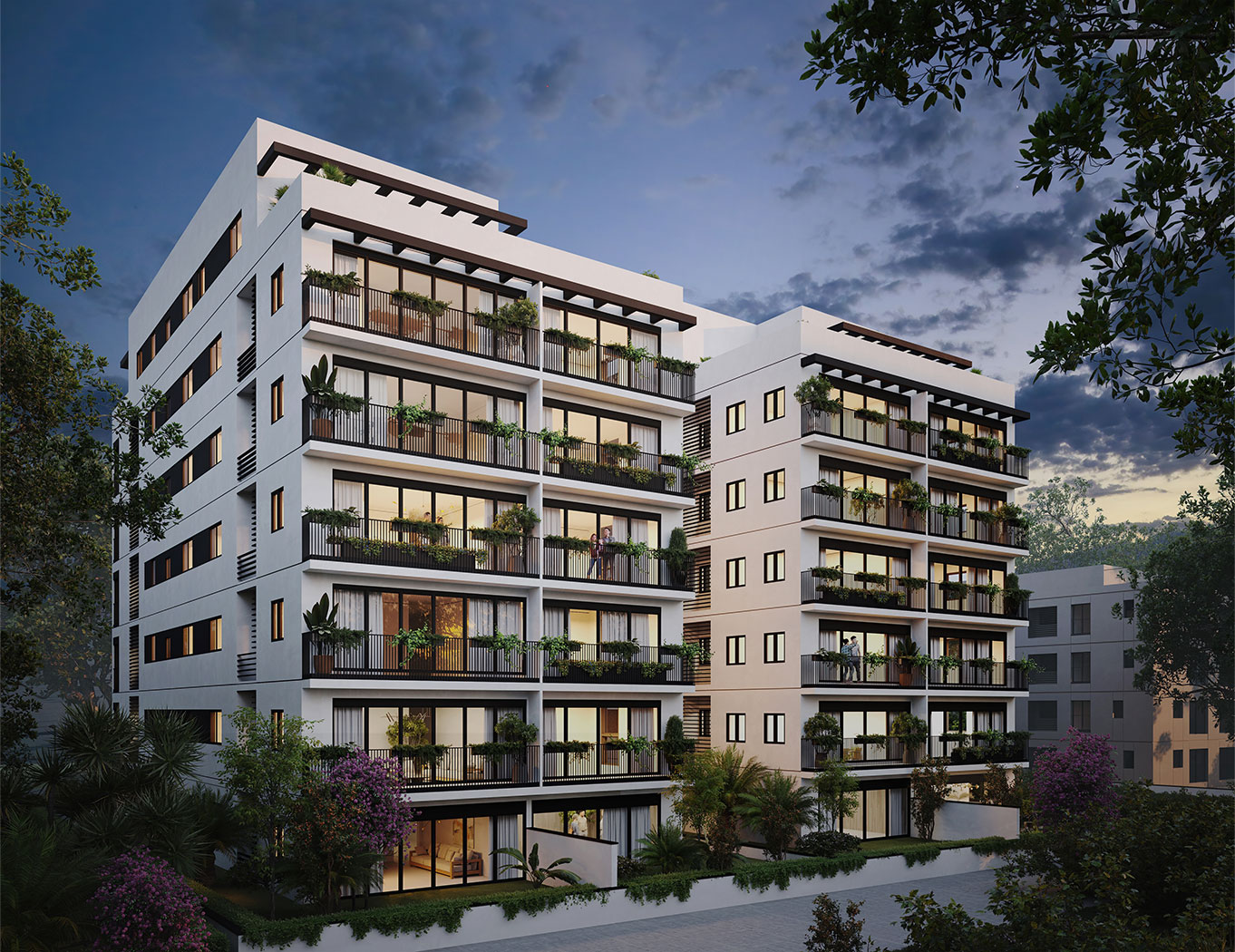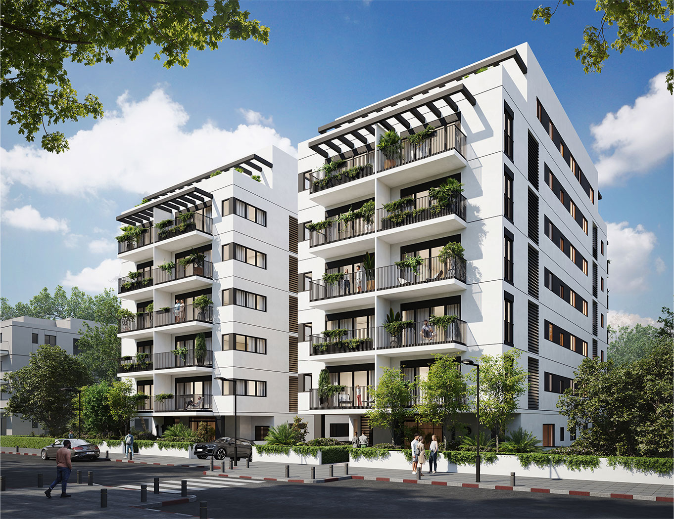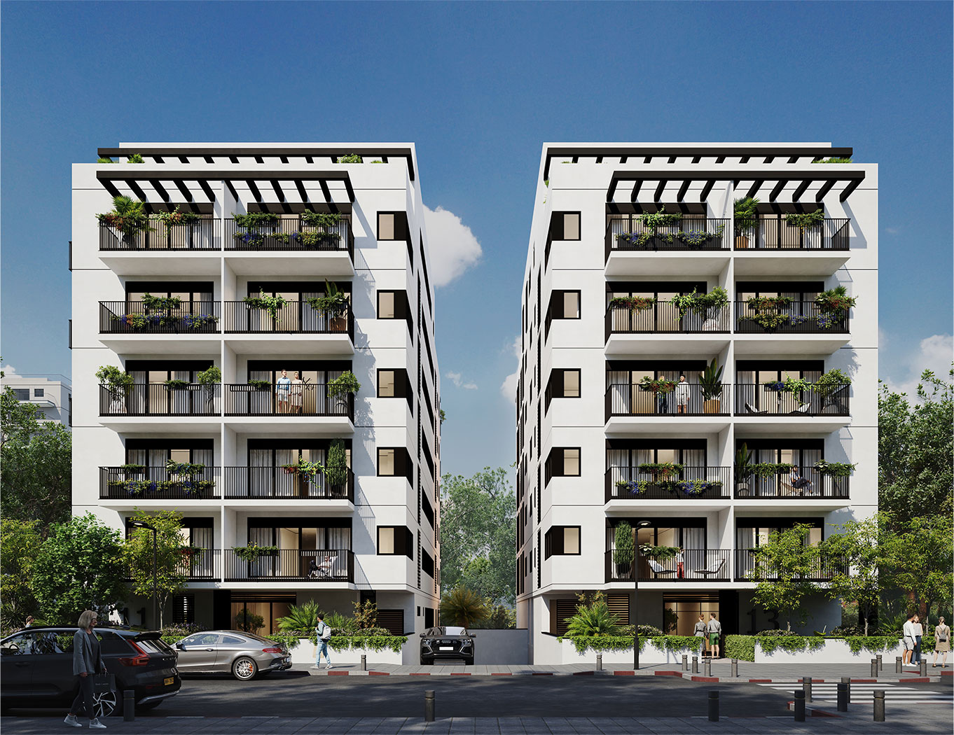 אדריכלות נקייה בשילוב אלומיניום וברזל בצבעי שחור לבן מרשימים. החזית היוקרתית עוטפת את הדירות המרווחות והמעוצבות בקפידה באחד האזורים המבוקשים בתל אביב. חניון תת קרקעי מרווח משותף עם חניה קונבנציונלית לדיירי שני הבניינים.